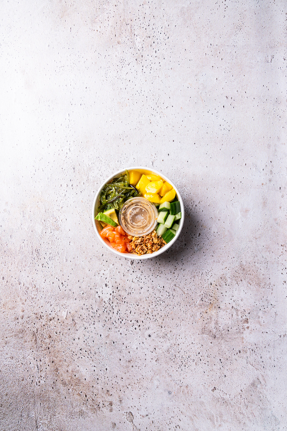 Poke bowl sesam: azijnrijst, rauwe zalm, wortelen, komkommer, avocado, mango, zeewier, ajuintjes, goma saus (pinda)